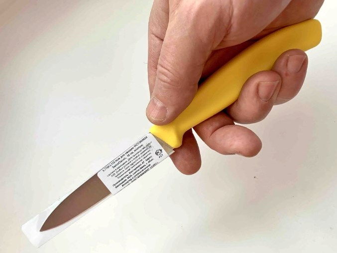 На картинке ручка ярко желтая, в реальности более спокойный цвет, мне так больше понравилось. Лезвие острое, режет все, длина универсальная. Привезли быстро в фирменной упаковке.